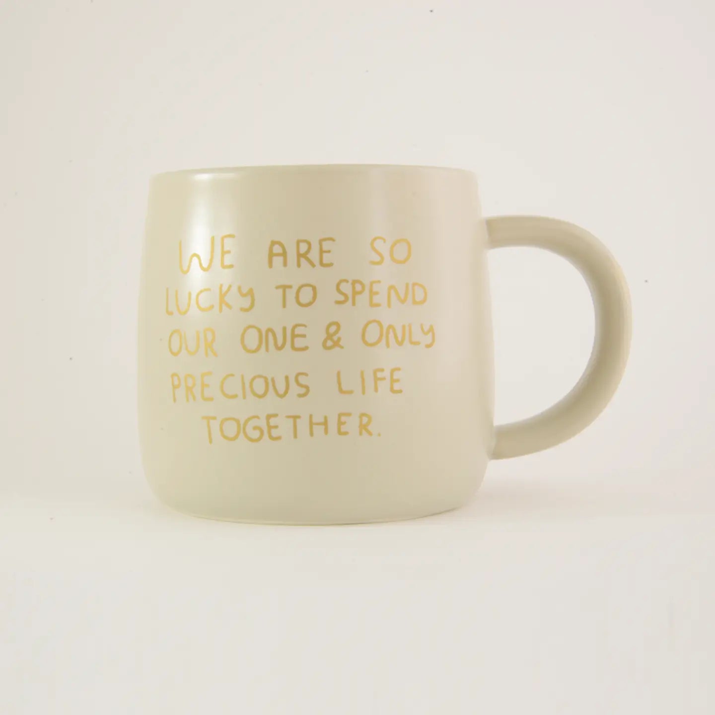 Ceramic mug. Microwave and dishwasher safe. Holds 12 oz.